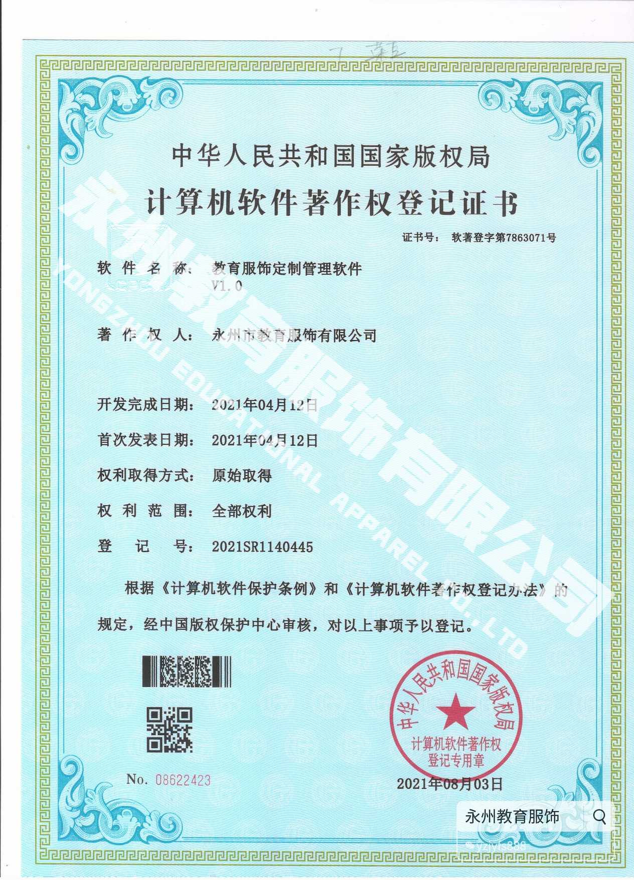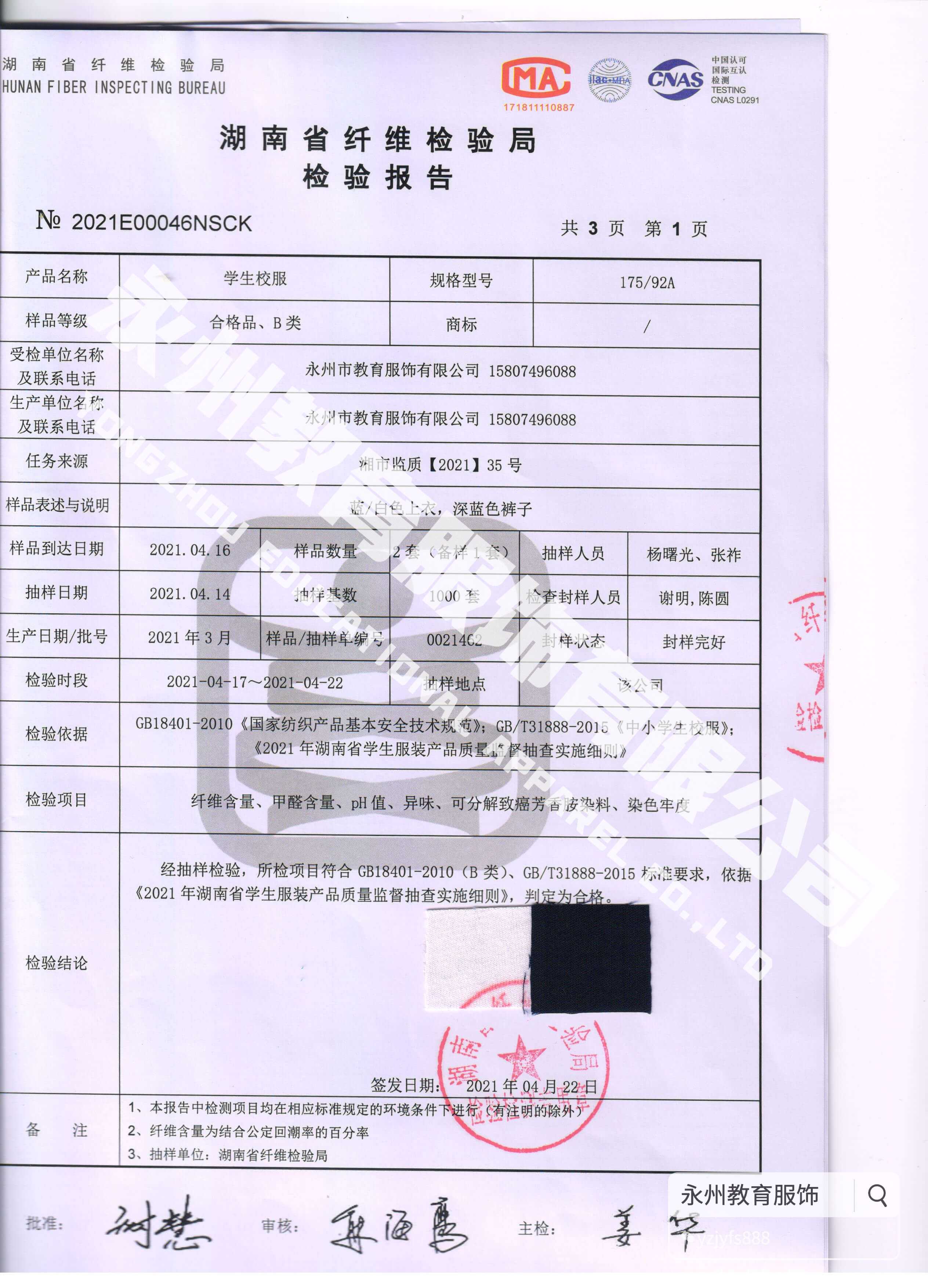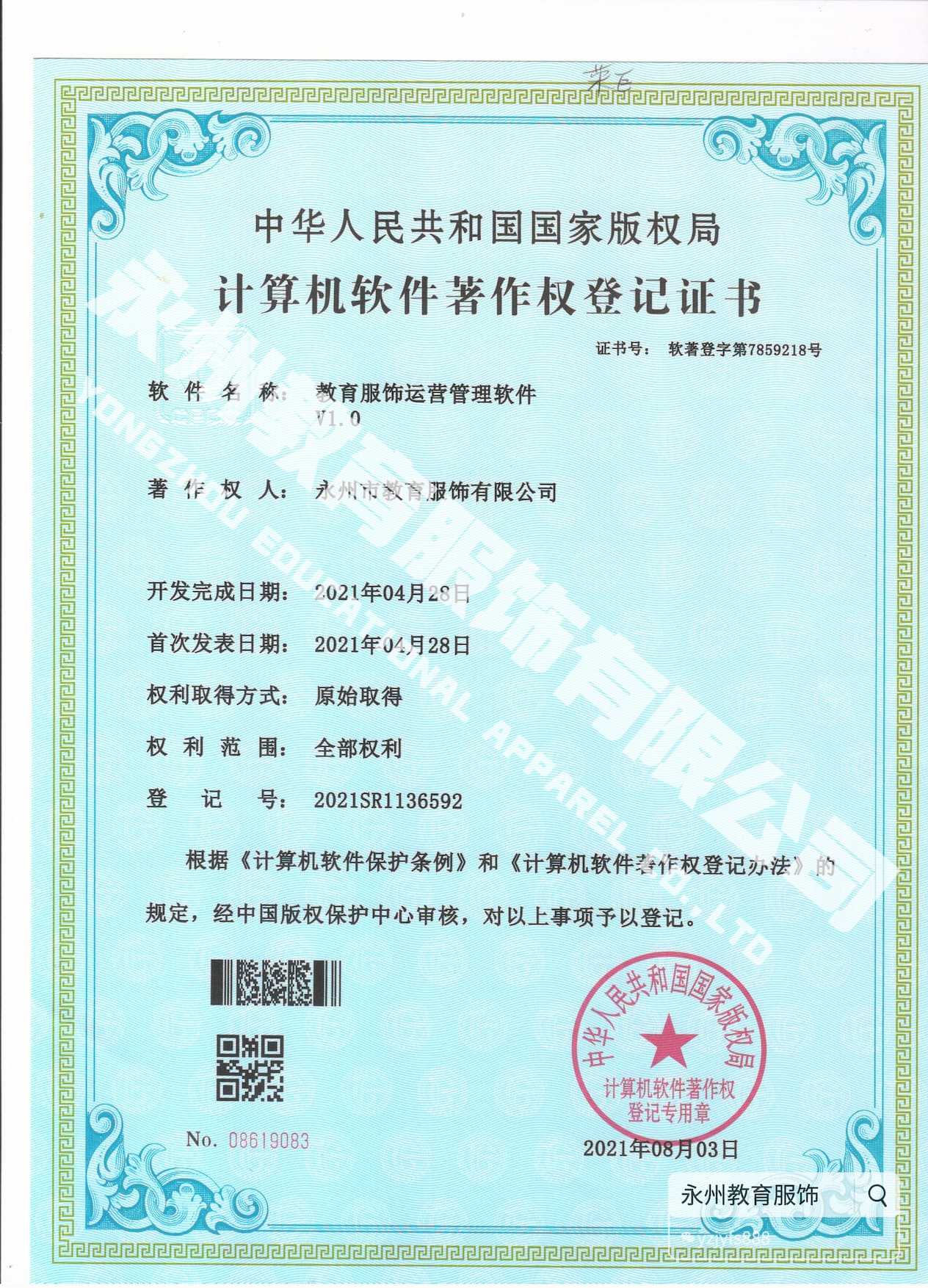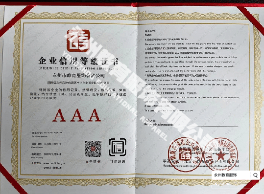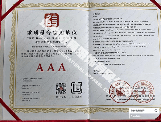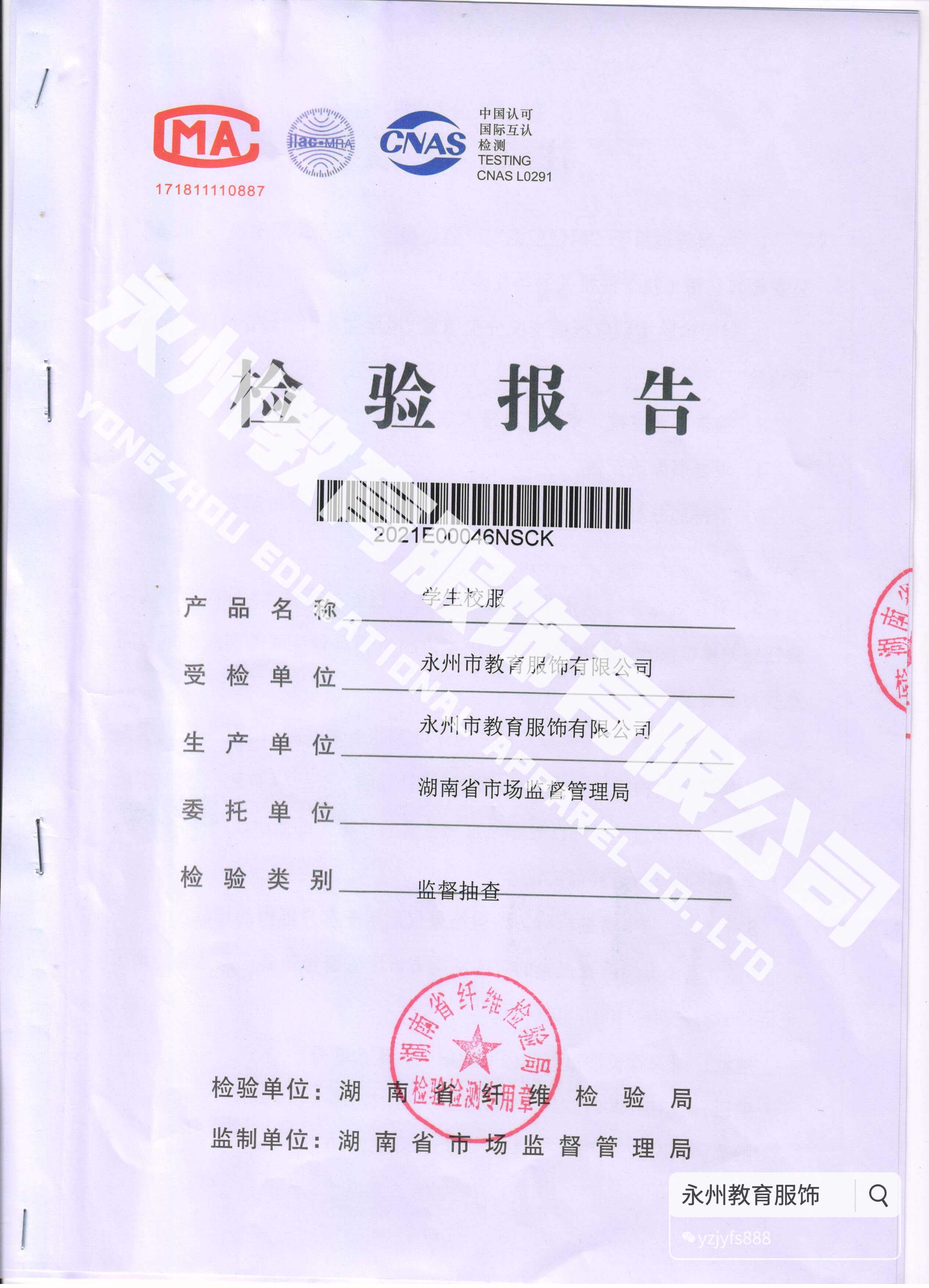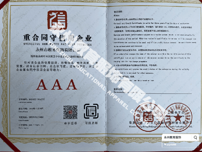 公司自成立以来,在全体员工的共同努力下,每年都参加湖南省的校服随机抽查,全部合格。在质量、服务、信誉各方面都得到了广大用户和单位机构的充分肯定。从2019年先后获得:企业信用等级证书、质量服务诚信单位、重合同守信用企业等信誉认可,公司旗下有三眼花翎等多个商标以及服装专业的专利,并成功通过了ISO9001:质量管理体系认证、职业健康安全管理体系认证、环境管理体系认证,形成了一套完善的品质、环境、职业健康安全管控体系。